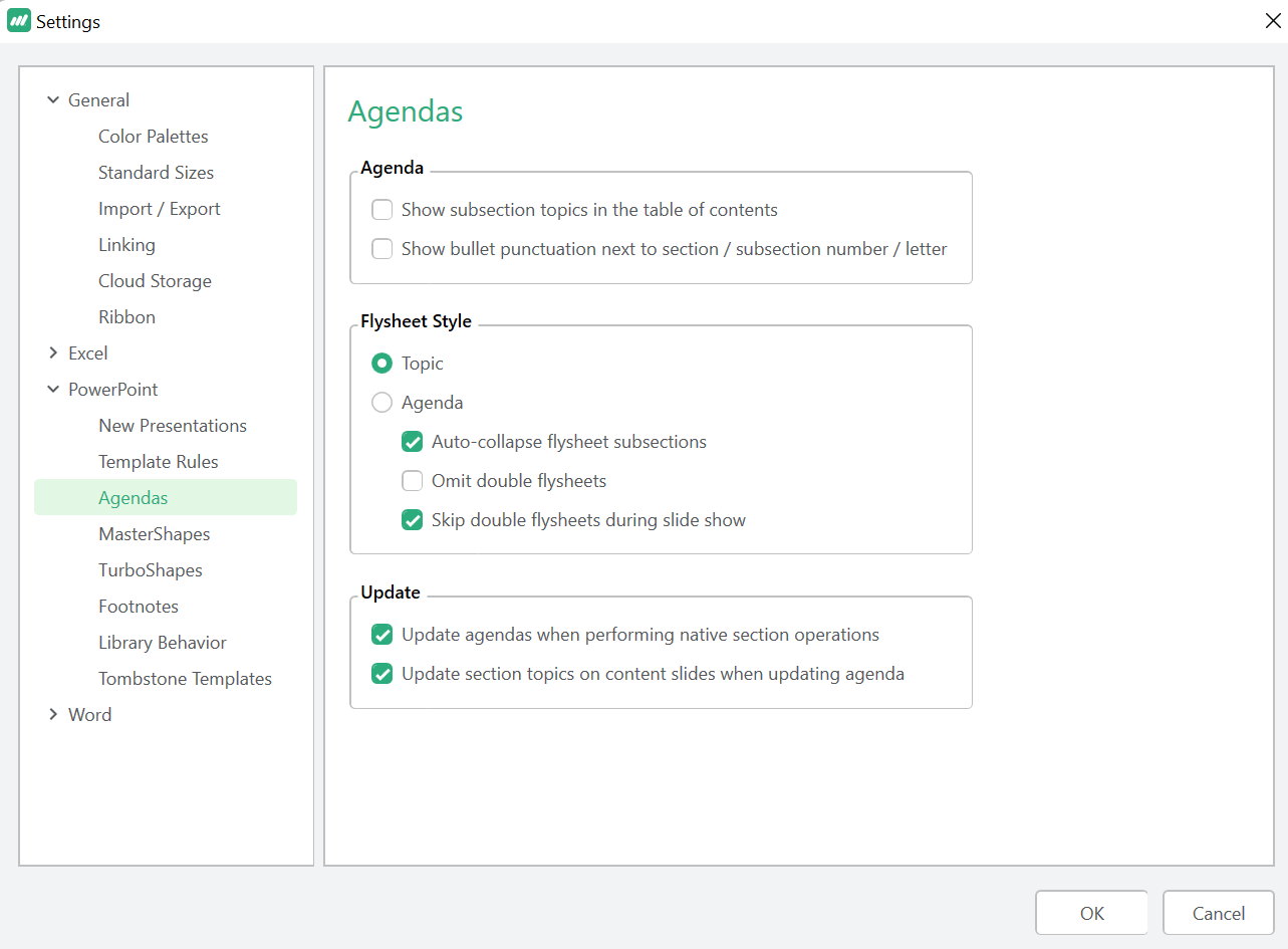 There are two conventions commonly used for flysheet layouts, and Macabacus supports both. These layout options are referred to as flysheet styles "Topic" and "Agenda," respectively, and can be switched back and forth with the click of a button. Set your preferred default flysheet style in the PowerPoint > Agendas section of the Settings dialog (pictured above), and at the presentation level from the Macabacus > Agenda > Agenda Options menu if you need to deviate from the default settings for an individual presentation.