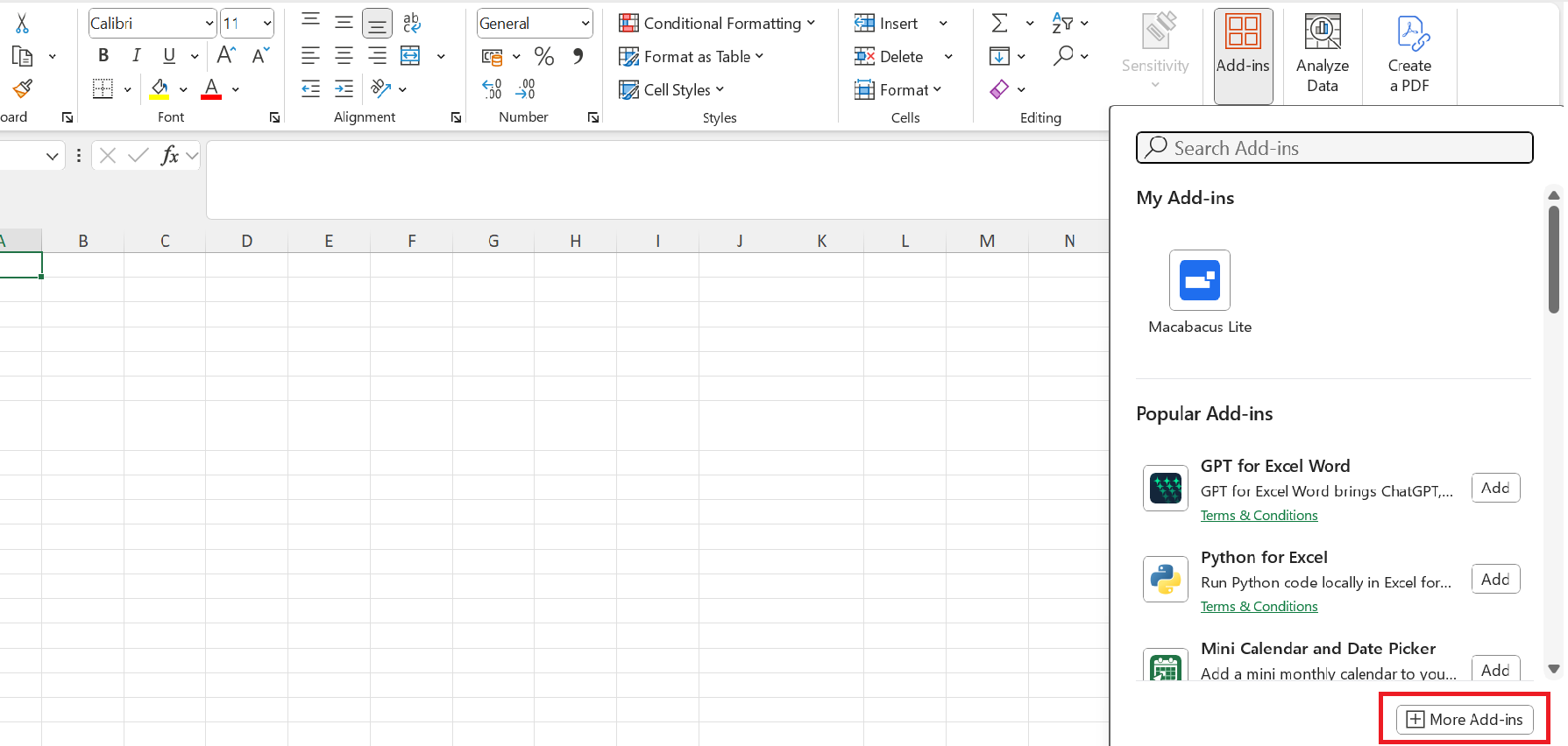- On the Home tab, or possibly on the Insert tab, in Excel, there should be a button labeled "Add-Ins". Click on "More Add-ins" at the bottom.