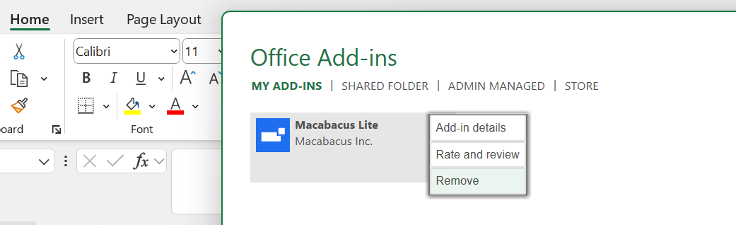 - Within the Office Add-ins dialogue, navigate to the 'MY ADD-INS' tab and click on the three dots to Remove.