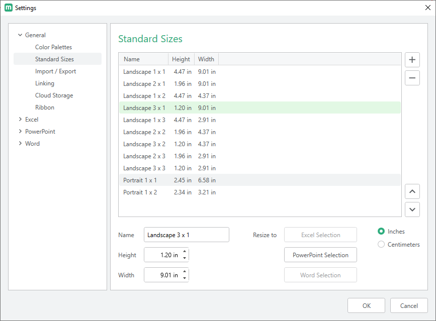 Standard Size dimensions can be modified in the General > Standard Sizes section of the Settings dialog accessible from the Macabacus > Settings menu. Dimensions can be adjusted manually in inches or centimeters, or set to the size of a selected object in Excel, PowerPoint, or Word. Clicking the Default Size button restores the size to Macabacus' default dimensions.